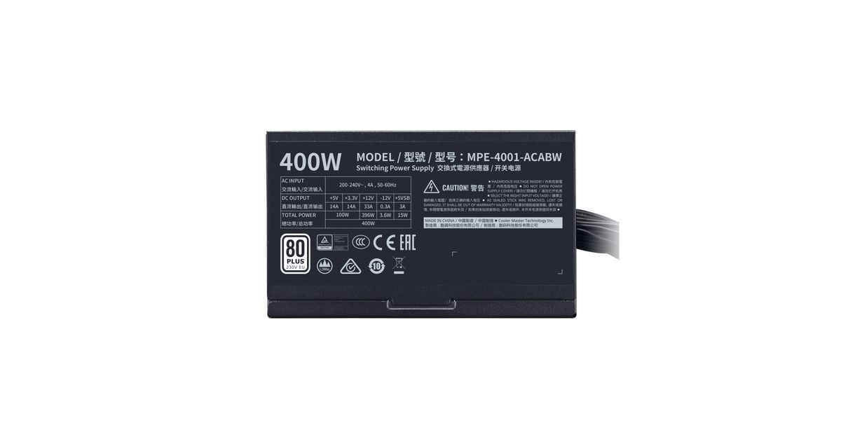 Cooler Master MWE 400 White 230V - V2, 400 W, 200 - 240 V, 50 - 60 Hz, 4 A, Aktiivne, 100 W