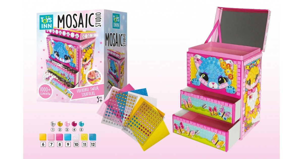 The casket with two drawers is a perfect place to store precious trinkets. The fun is in decorating it yourself. Just match the colorful elements to the corresponding figures and enjoy the result of your creative work. The casket is also equipped with a mirror, which is located on the inside of the lid.