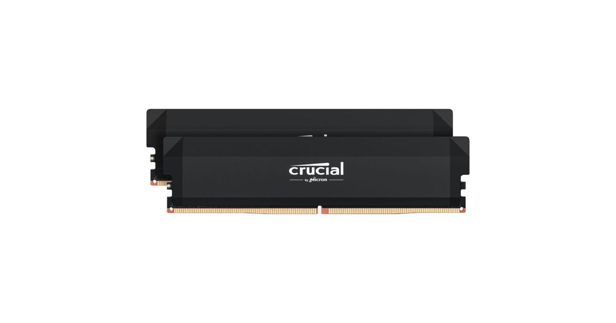 Crucial Pro OC 64 GB DDR5 gaming desktop kit consisting of two overclocking 32 GB DDR5 Pro gaming desktop modules with black aluminium heat sinks operating at a speed of 6400 MT/s and a CAS latency of 40. It is a UDIMM and conforms to the industry standard DDR5 UDIMM with 288 pins. It is compatible with systems that can use DDR5-6000 UDIMM memory. It has plug-and-play compatibility and enables stable overclocking with Intel XMP 3.0 and AMD EXPO.