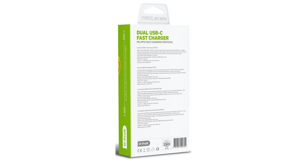 D-Fruit DF100 USB vooluadapter pakub kiiret ja efektiivset laadimist nii kodus kui reisil olles. Nutikas Turbo Power Engine tuvastab automaatselt laetavad seadmed, tagades kiireima võimaliku laadimise. Alumiiniumist ja vaskplekist jahutussüsteem tagab tõhusa soojuse hajutamise muutes laadimise turvaliseks. Lisaks laadijale on komplektis kaasas ka USB-C - USB-C 1 m kaabel.