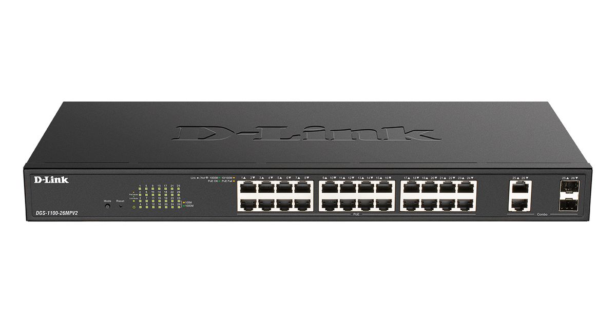 D-Link DGS-1100-26MPV2, Juhitav, L2, Gigabit Ethernet (10/100/1000), Täisdupleks, Power over Ethernet tugi, Püstikmontaaž