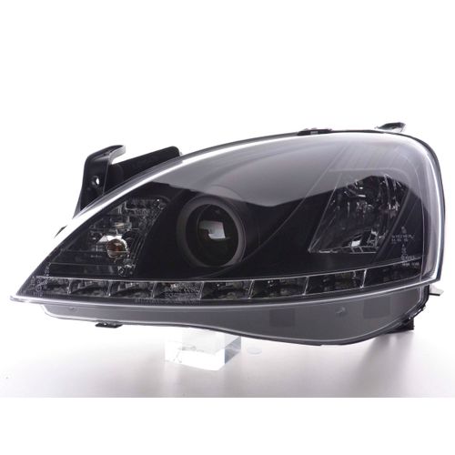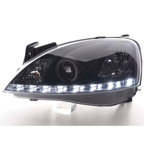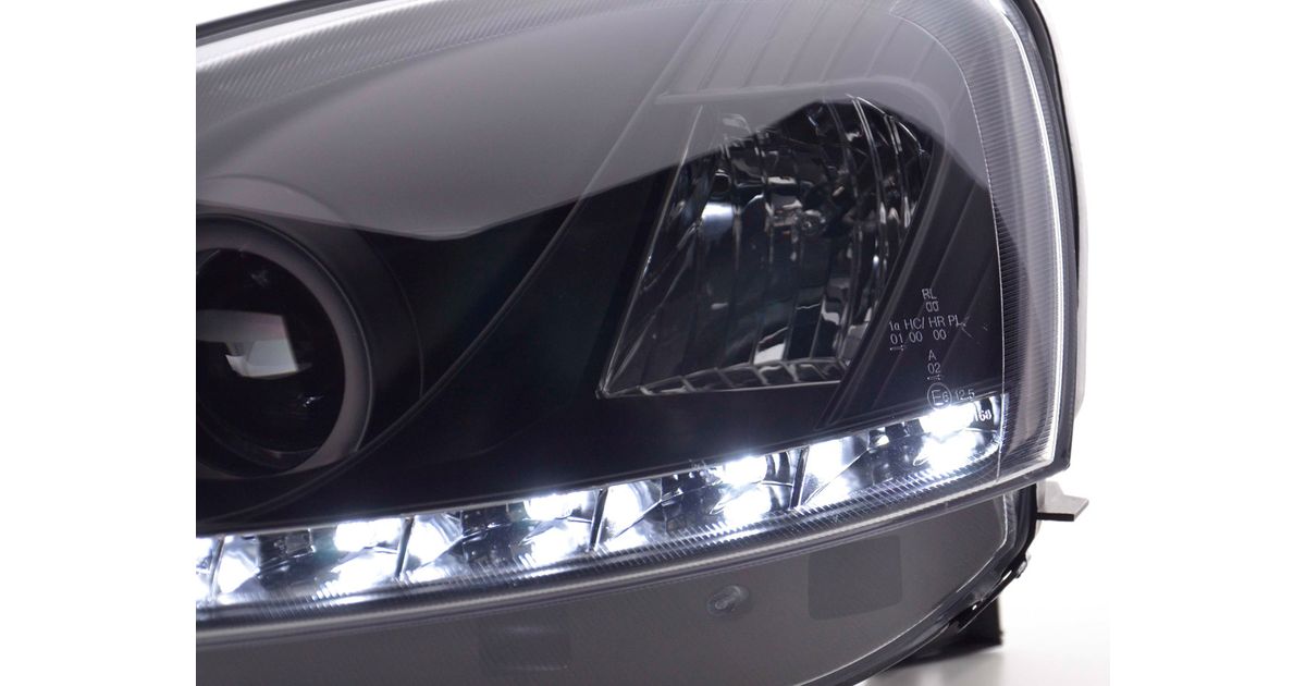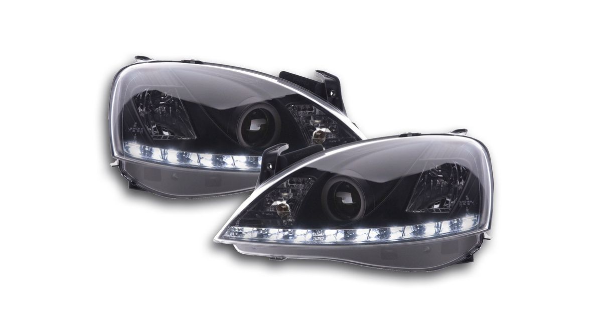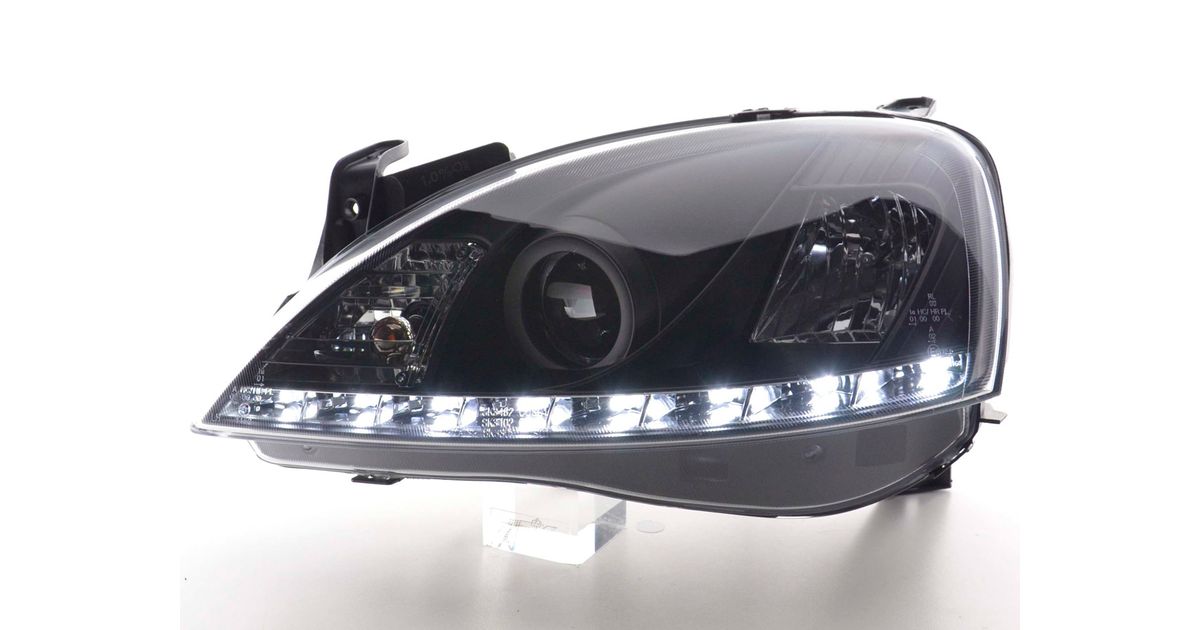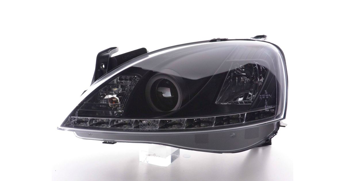 for Opel Corsa C for year of construction: 2001 to 2006 with E mark (registration free) with electr. Headlight range adjustment without servomotor Color: Black Low beam: H1 High beam: H1 with R87 approval for daytime running lights Daylight headlights with LED daytime running lights link