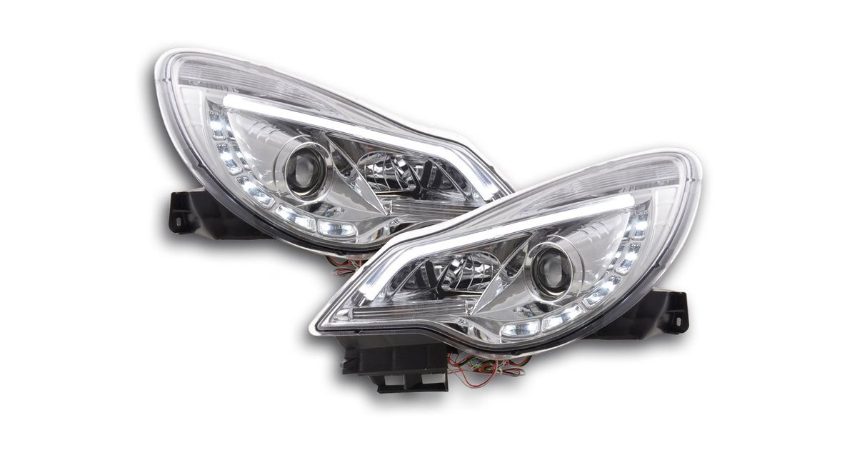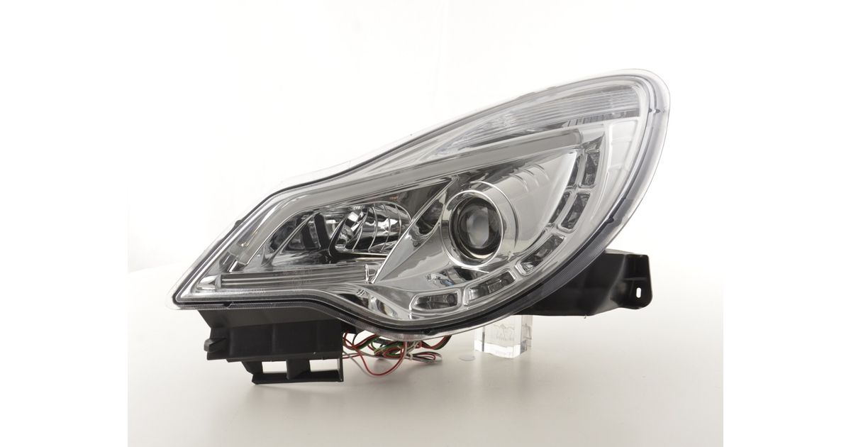 for Opel Corsa D for year of construction: from 2011 with E mark (registration free) with electr. Headlight range adjustment without servomotor Color: chrome with R87 approval for daytime running lights not suitable for OPC Line + cornering light Daylight headlights with LED daytime running lights