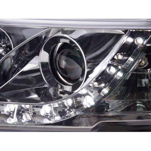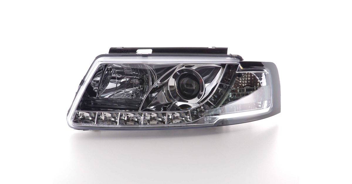for VW Passat (B5 / 3B) for year of construction: 1997 to 2000 with E mark (registration free) with electr. Headlight range adjustment without servomotor Color: chrome with integrated turn signal Daylight headlights with LED parking light
