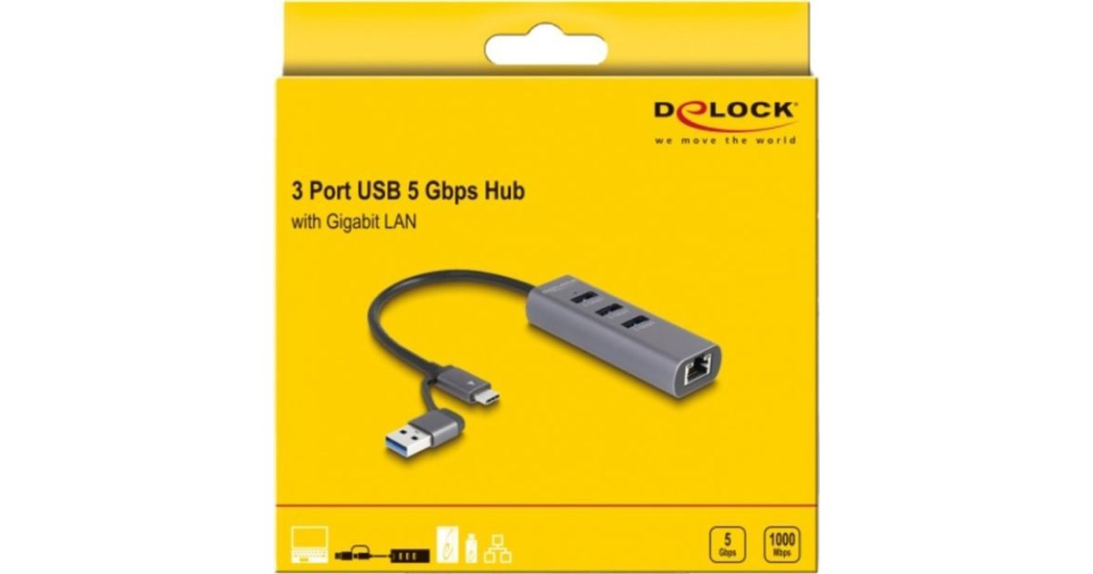 DeLOCK 3 Port USB 5 Gbps Hub + Gigabit LAN with USB Type-C or USB Type-A connector in metal case