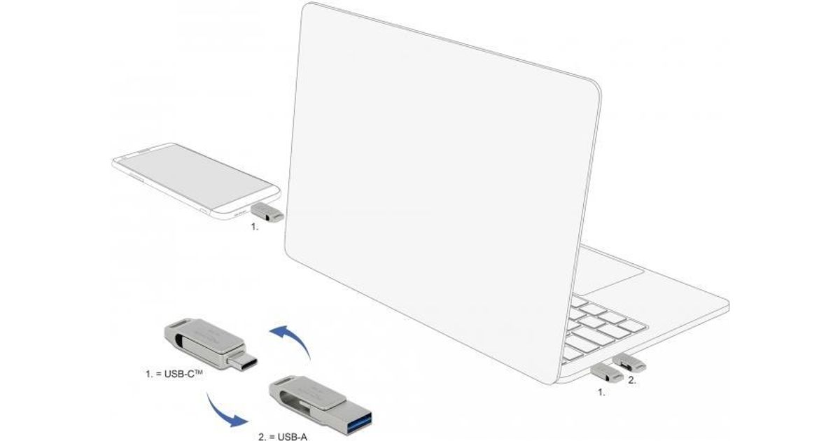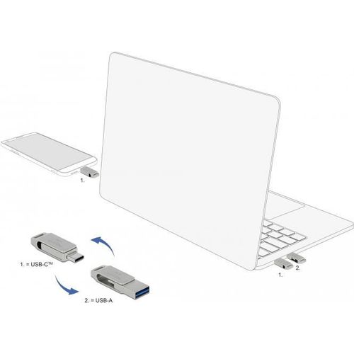 This USB memory stick by Delock can be used to save and transport data, e.g. photos, videos or music. The USB stick can be connected optionally via the USB Type-C™ or USB Type-A plug, the inner part is simply turned and then latch into place. Due to the stylish design with eyelet, the small USB memory stick can be easily attached to the key ring for transport.