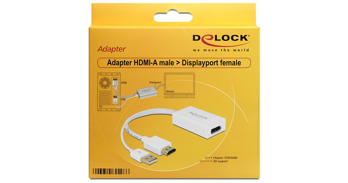 See Delocki adapter võimaldab ühendada DisplayPort-monitori süsteemiga tasuta HDMI-liidese kaudu. Adapter toetab eraldusvõimet kuni 4K Ultra HD sagedusel 30 Hz ja on tagasiühilduv Full-HD 1080p-ga.