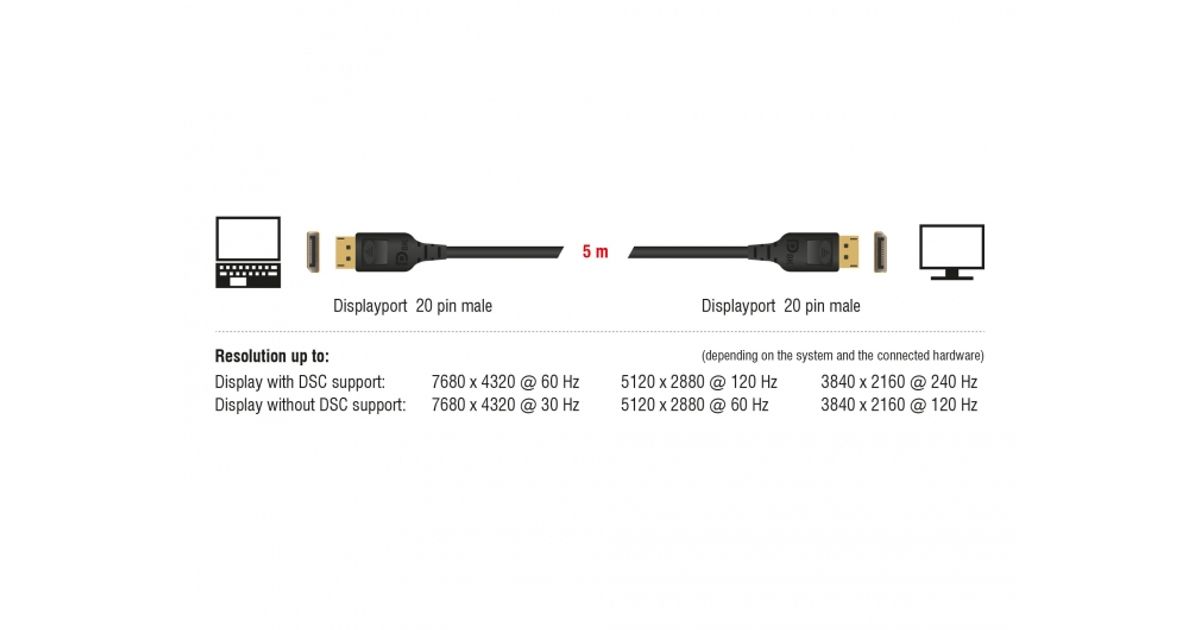 Seda Delocki sertifitseeritud DisplayPort-kaablit kasutatakse DisplayPort-liidesega seadmete, näiteks monitoride, projektorite või telerite ühendamiseks arvuti või sülearvutiga. Toetades maksimaalset ribalaiust 32,4 Gb/s, saab sisu kuvada 8K Ultra HD (7680 x 4320 @ 60 Hz) resp. 5K (5120 x 2880 @ 120 Hz) ja 4K Ultra HD (3840 x 2160 @ 240 Hz) resolutsioonis. Kvaliteetne, kolmekordselt varjestatud kaabel parandab oluliselt ka heliülekannete kvaliteeti, mille proovivõtusagedus on kuni 1536 kHz.