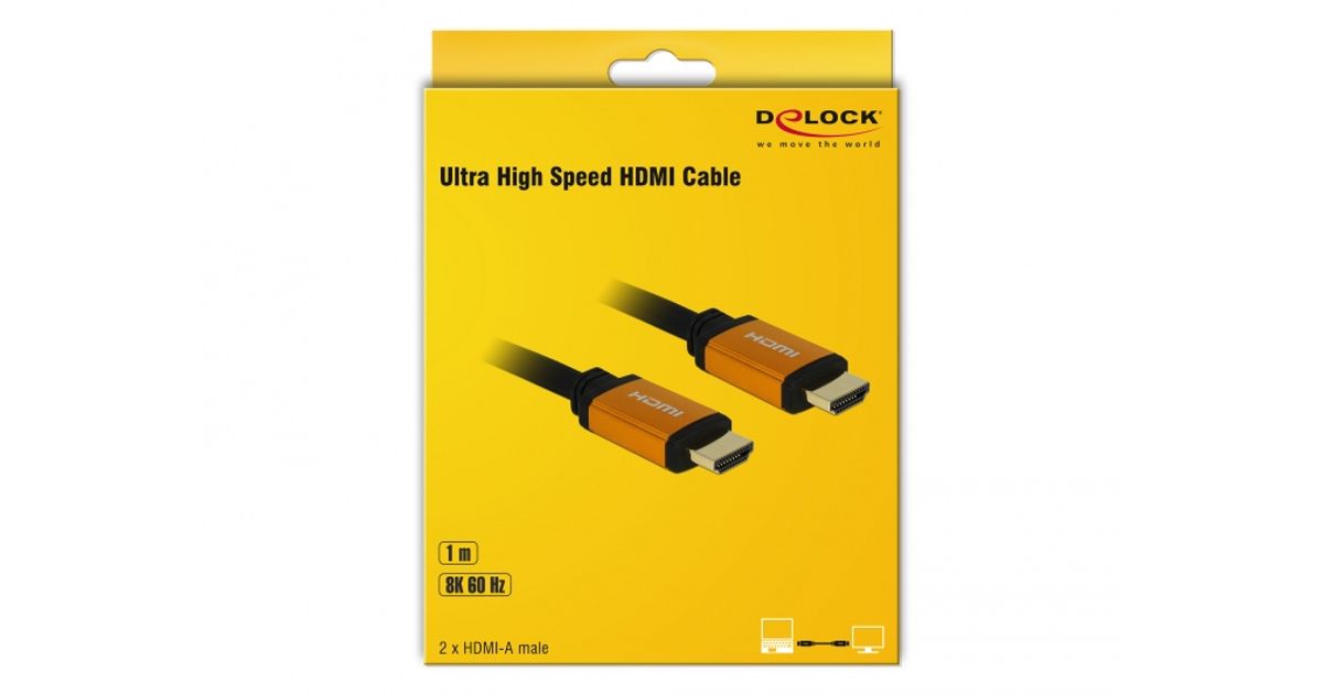 DeLOCK 85727, 1 m, HDMI tüüp A (Standard), HDMI tüüp A (Standard), 7680 x 4320 pikslit, 48 Gbit/s, Must, Kuld