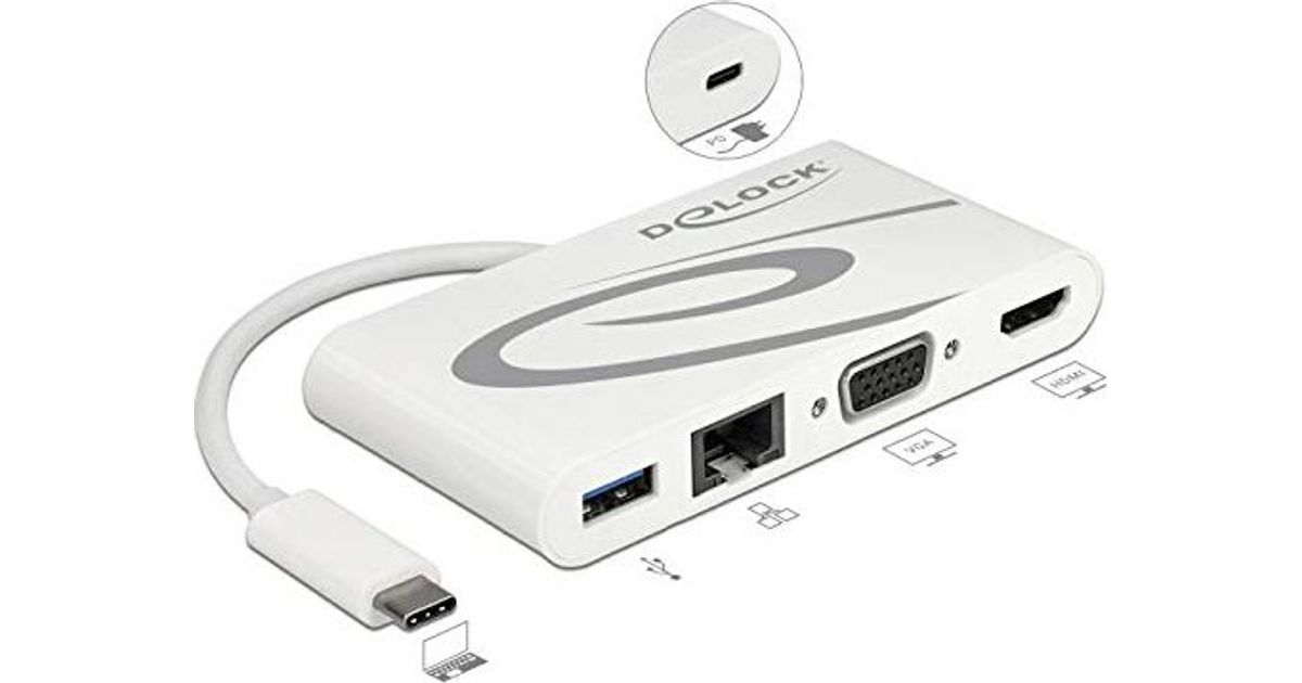 DeLOCK 87731, USB 3.2 Gen 1 (3.1 Gen 1) Type-C, HDMI, RJ-45, USB 3.2 Gen 1 (3.1 Gen 1) Type-A, USB 3.2 Gen 1 (3.1 Gen 1) Type-C, VGA, 3840 x 2160 pikslit, Hall, Valge, 0,14 m, Kiire Ethernet, Gigabit Ethernet