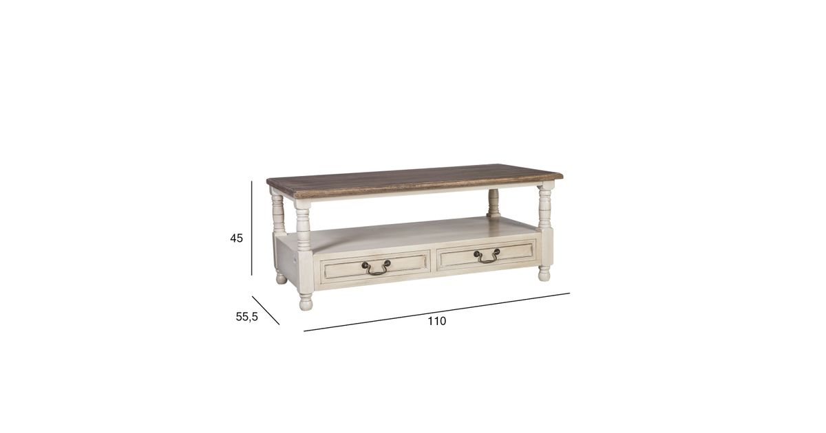Lauaplaat: antiikpruun, raam/sahtlid: antiikvalge. 2 sahtlit metallist käepidemetega. Puit: saar/paulownia/MDF, viimistlus: värvitud.