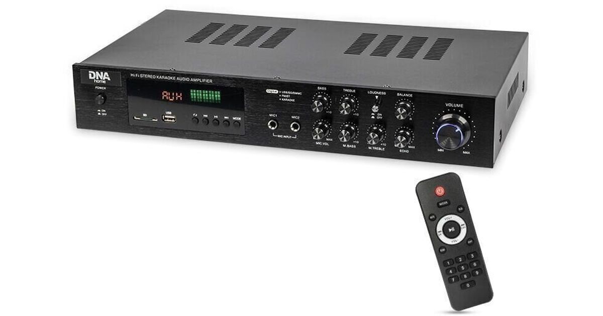DNA AMPLI 5.0 is a 5.0 amplifier equipped with Bluetooth connectivity, FM radio, USB and SD card inputs. It is an offer from the DNA HOME series, created specifically for home applications. This multi-purpose system is designed mainly for karaoke which is possible thanks to two microphone inputs with echo control. The DNA AMPLI 5.0 offers five channels to support all the speakers needed for the ultimate quality of surround sound. You can play songs directly from the USB input or SD card as well as connect wirelessly with your digital library via Bluetooth. In addition, you can listen to your favorite radio stations in HiFi surround sound using the FM radio tuner.Surround sound processorThe main feature of the DNA AMPLI 5.0 audio amplifier is the conversion of a stereo signal into a 5.0 signal. An internal processor ensures proper sound distribution, providing the desired surround experience. Customizing the sound to your liking is possible with bass and treble controls and a convenient volume potentiometer.Line inputs, Bluetooth, MP3, FM radio and AUXThe DNA AMPLI 5.0 offers many options for listening to music. You can stream music wirelessly to the amplifier such as via Bluetooth. This allows you to enjoy a greater wireless range while maintaining sound quality. Another way is to put your MP3 playlist on a USB flash drive or SD card and use the built-in MP3 player. The FM radio is also included so you can listen to your favorite radio station with excellent sound quality. Two RCA line inputs of DNA AMPLI 5.0 offer additional options for connecting all kinds of equipment, such as a CD/DVD player.Reliable audio equipment for karaokeIf you need karaoke equipment, the DNA AMPLI 5.0 is the best choice. With two microphone inputs, you can sing along with the songs of your favorite artist, alone or in a bunch of people. Bass and treble adjustments as well as an adjustable echo effect will make the sound of your voice exceptionally high-quality.Amplifier features:1-channel receiver systemoutput power: 400W (200W + 200W)MP3 player with USB port/SD card readerdigital displayBluetooth receiver for wireless audio streamingbass and treble adjustmentdual microphone input with volume, tone and echo controlsstereo line inputs (RCA)remote control includedTechnical specification:Power supply: AC 220-240V, 50/60 HzOutput power: 400W (200W + 200W)Power consumption: 600WImpedance: 4/8/16 ohmPlayback options: Bluetooth, FM radio, SD card, USBPanorama: adjustableHigher volume button: yesMicrophone inputs: 2Microphone echo effect: adjustableFM frequency range: 87.5 - 108 MHzInputs: 2 x AUX, SD, USB, MIC1, MIC2Outputs: 1 x LINE, FR + FL + SR + SL + CBass correction: -10 dB to +10 dBTreble correction: -10 dB to +10 dBMicrophone bass correction: -10 dB to +10 dBMicrophone treble correction: -10 dB to +10 dB