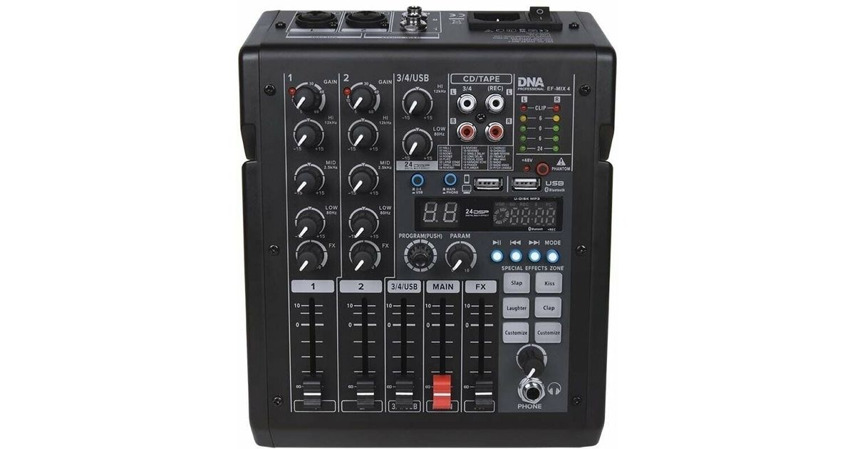 Introducing the DNA EF-MIX 4, a compact and user-friendly audio mixer designed for versatility. This mixer boasts 4 channels and comes equipped with a range of features, making it an excellent choice for various applications, including rehearsal rooms, professional studios, home studios, vocalists, bands, DJs, or simply expanding your current console.Key Features:Compact size with a wealth of features and superior sound quality4 channels supporting a variety of inputs, including combo signal inputs (XLR + 6.3 mm jack) for microphones or instruments and USB inputs for added flexibilityIntuitive controls on each channel for adjusting signal levels, gain, treble, mid, and bass boost, along with the convenience of DSP effectsSlider faders for precise volume control, complemented by a sound level meter to quickly identify clippingOutput options for speakers and external devices, with headphone monitoring capabilitiesDouble USB port with a built-in MP3 player for seamless connectivityBluetooth capabilities for wireless playback from your computer or phoneRCA inputs and outputs for connecting external recorders or playersHigh sound quality ensured by low distortion, high signal-to-noise ratio, wide frequency response, and 24-bit resolution of DSP effectsBluetooth playback for convenient wireless music streamingAbility to upload two custom samples, enhancing creative possibilities for eventsBuilt-in TAP panel with four standard special effects, easily triggered with a simple finger movement