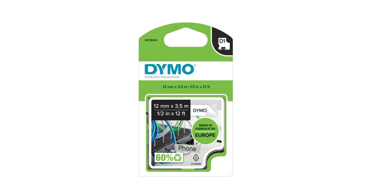 DYMO D1 Durable - Black on White - 12mm markeerimisteip Must valgel taustal