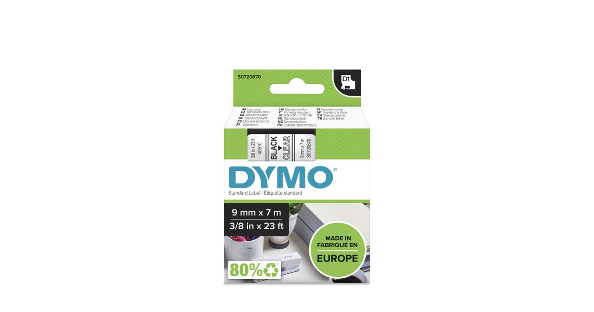 DYMO D1 Standard - Black on Transparent - 9mm, Must läbipaistval taustal, Polüester, Belgia, -18 - 90 °C, DYMO, LabelManager, LabelWriter 450 DUO