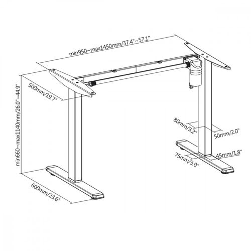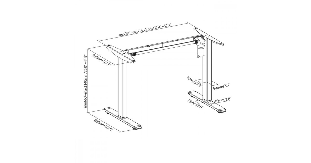 The solid steel construction ensures high stability and durability. The table frame has a maximum load capacity of 80 kg. Thanks to the detailed instructions, assembly of the table is quick and uncomplicated. Thanks to the built-in motor, the height of the table can be continuously adjusted from 66 to a maximum of 114 cm. The control with up and down buttons is very easy. The maximum speed of 25 mm/s allows for quick height adjustment. In addition to the electric height adjustment, you can manually adjust the width from 95 to 145 cm. The table top is sold separately - the user is free to choose the colour, size and thickness of the table top.