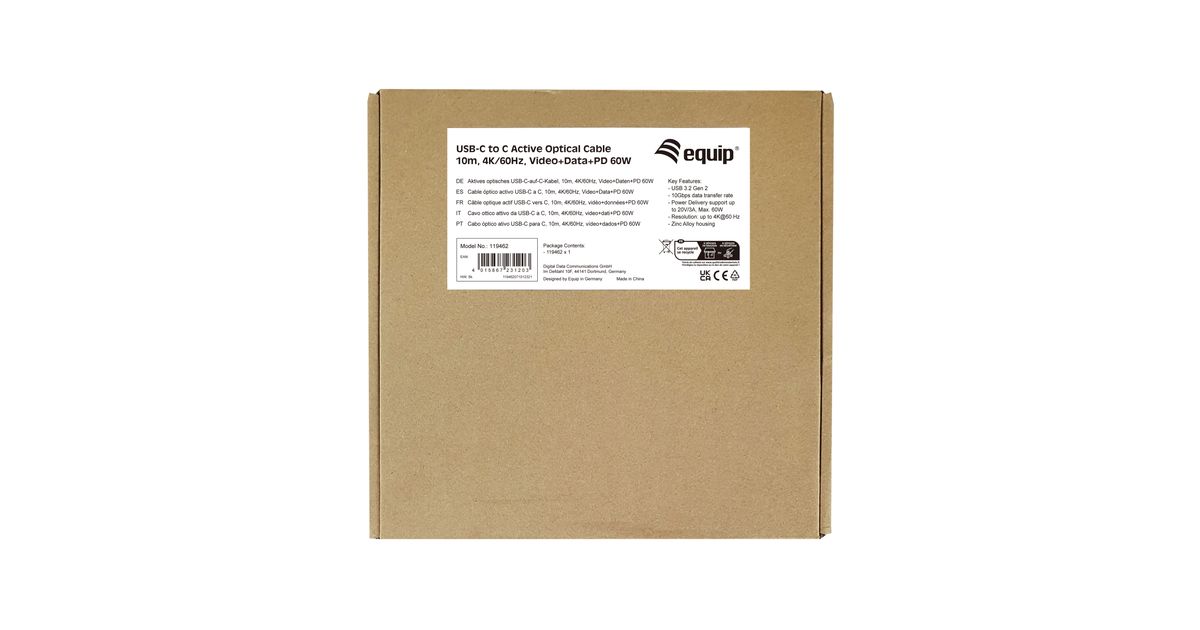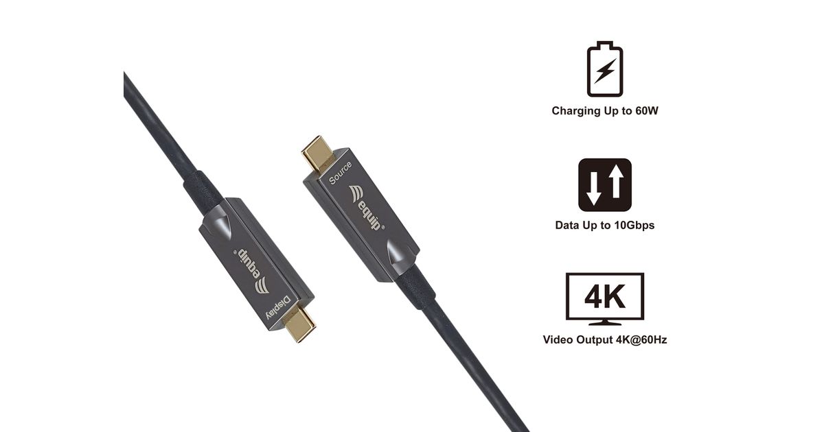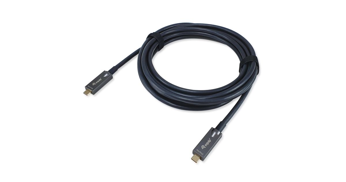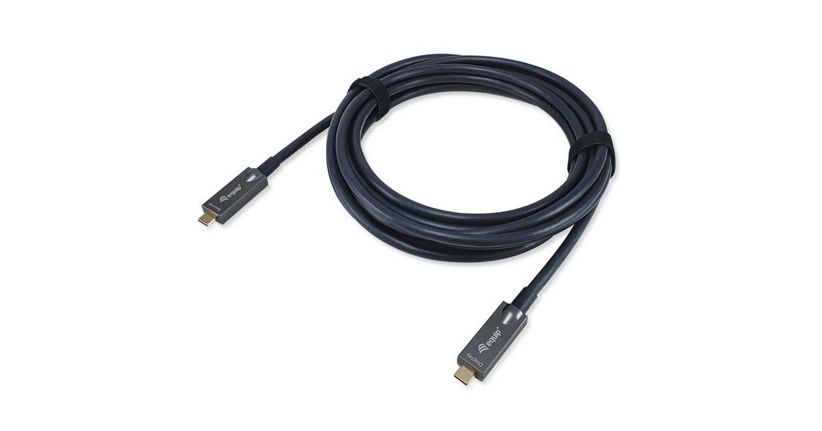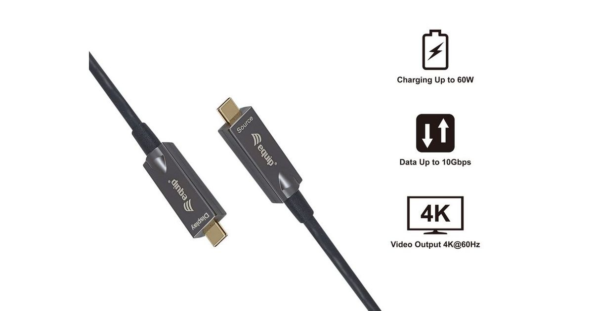 Das equip 119461 aktive optische USB-C-auf-C-Video+Daten+PD kabel ermöglicht die Videoausgabe. Es verwendet aktive optische Technologie, um sicherzustellen, dass Signale über größere Entfernungen mit minimalen Störungen und Verlusten übertragen werden als bei herkömmlichen Kabeln. Das Kabel ist mit USB-C-Geräten wie Laptops, Tablets und Smartphones kompatibel und kann für verschiedene Zwecke zur Anzeige von Videoinhalten auf externen Monitoren verwendet werden.
