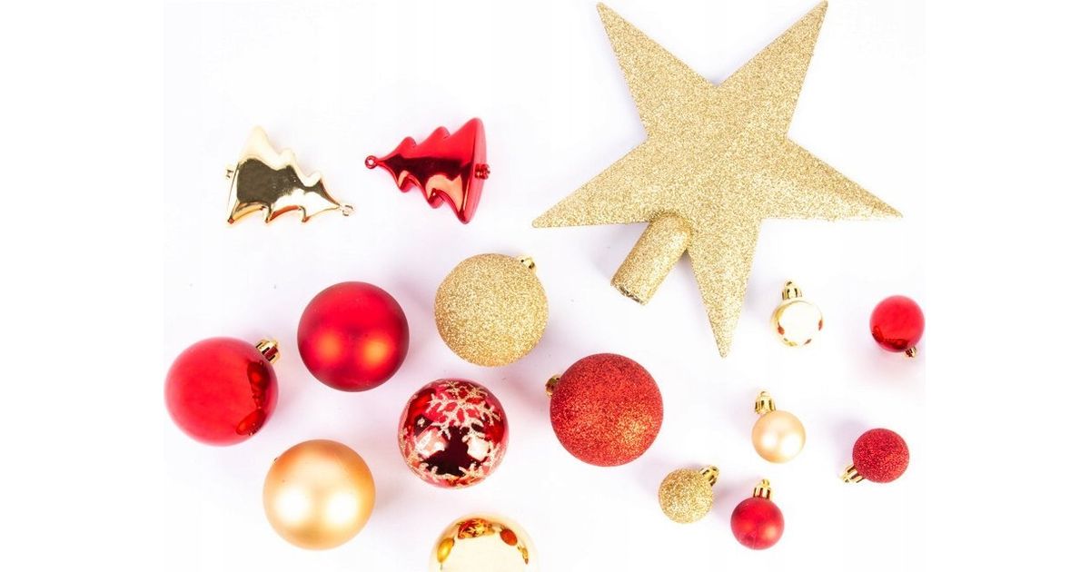 Féérici tuled ja jõulukomplekt jõulukuuse ehte + täht, komplektis 44 tükki, punane ja kuld