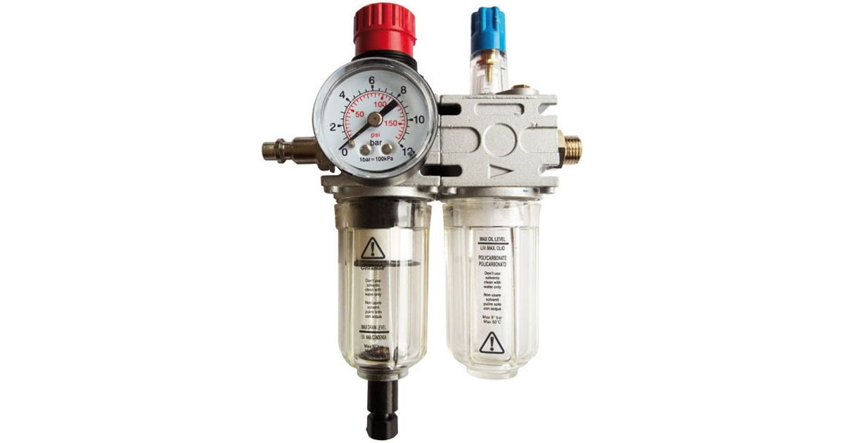 Filter-regulaator (F/R-L) koos õlitajaga. Eraldab ja kogub 96% niiskusest/veest. Reguleerimise vahemik 0.5-11 bar.