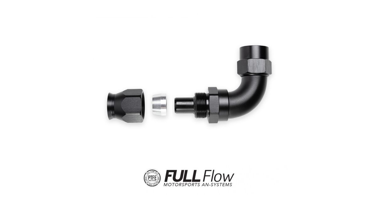 Nuke Performance Full-Flow PTFE Hose End Fittings. Available in AN-6, AN-8, AN-10, and AN-12. High quality, lightweight, full flow hose end fittings for PTFE lined fuel hose.