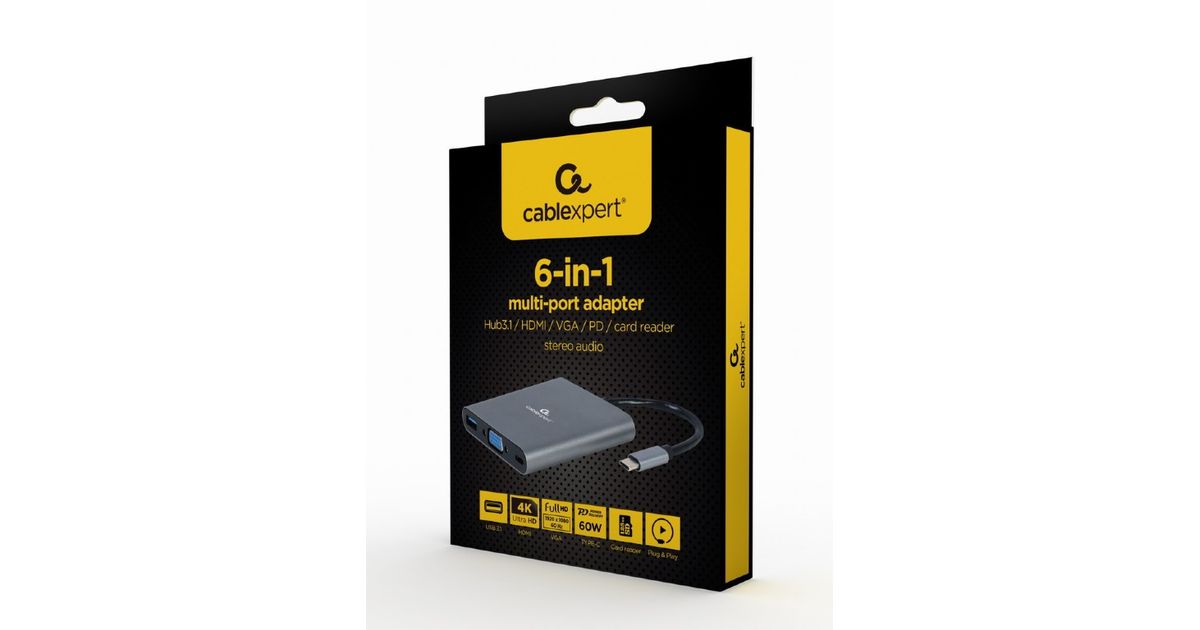 Gembird A-CM-COMBO6-01, USB 3.2 Gen 1 (3.1 Gen 1) Type-C, 3.5mm, HDMI, USB 3.2 Gen 1 (3.1 Gen 1) Type-A, USB tüüp-C, VGA, MicroSD (TransFlash), SD, 5000 Mbit/s, 3840 x 2160 pikslit, Hall