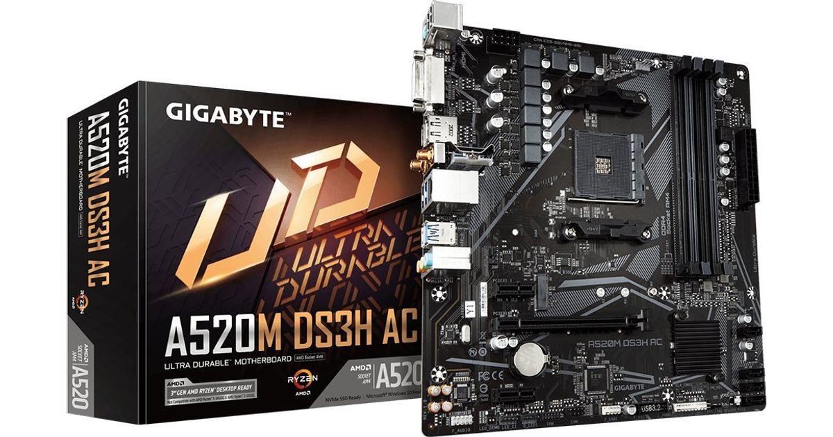 A520M DS3H AC Motherboard - AMD Ryzen 5000 Series CPUs, 5+3 Phases VRM, up to 4733MHz DDR5 (OC), 1xPCIe 3.0 M.2, GbE LAN, WIFI 5, USB 3.2 Gen 1