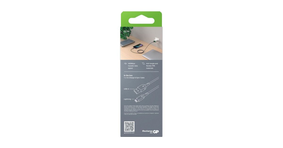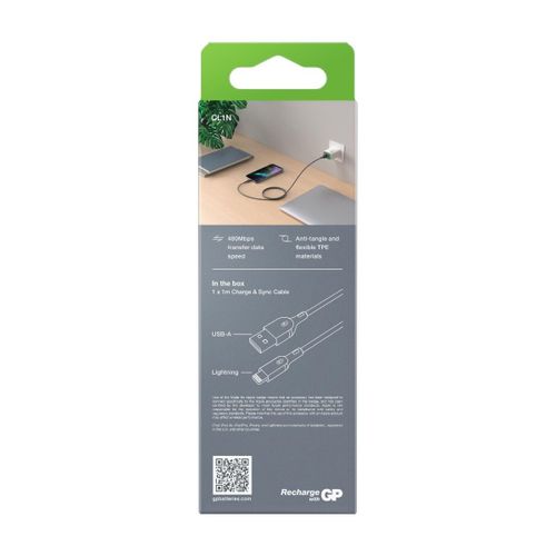 GP Batteries CL1N, 1 m, Lightning, USB A, USB 2.0, 480 Mbit/s, Hall