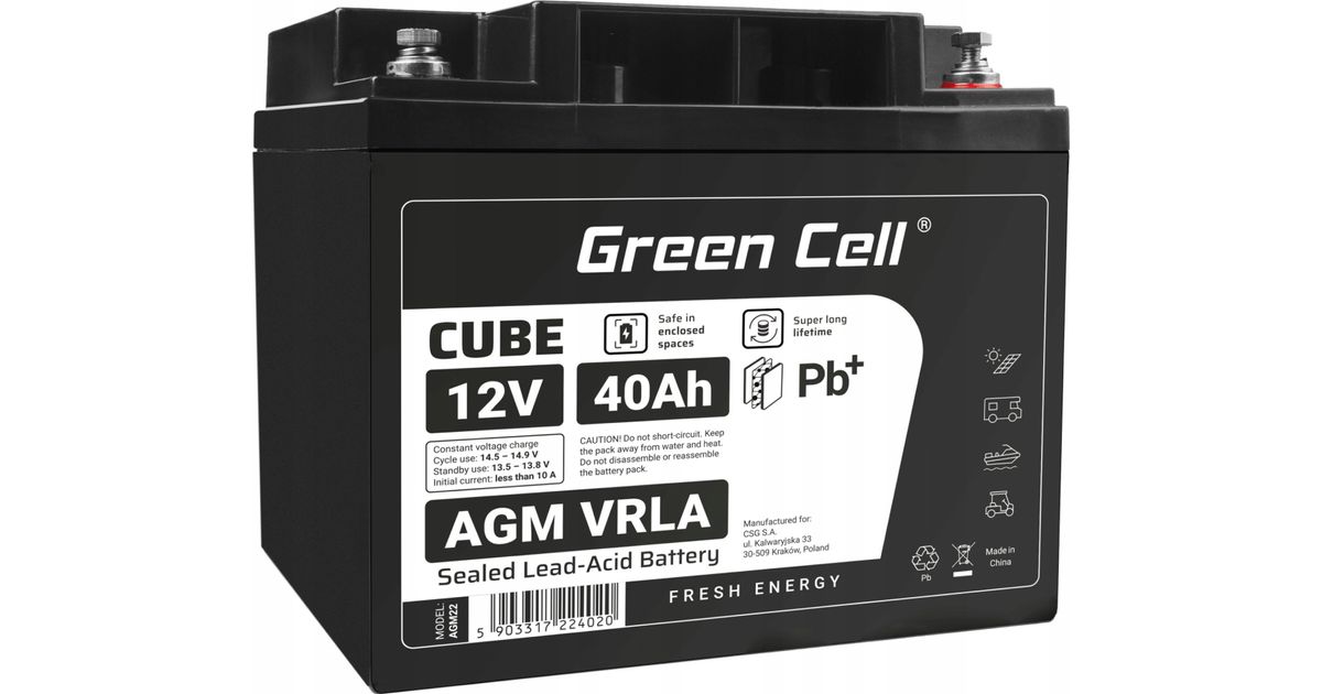Green Cell Green Cell Cube AGM VRLA IP54 12V 40Ah hooldusvaba aku muruniiduki rolleri paadi ratastoolile