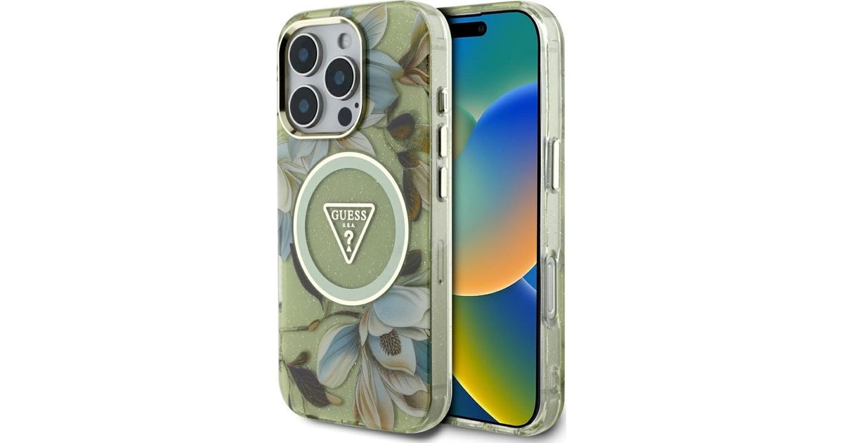 Guess Glitter Lillede kolmnurganupud Magsafe Case for iPhone 16 Pro Green