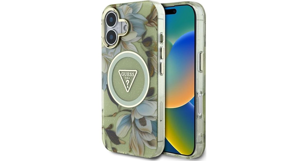 Guess Glitter Lillede kolmnurganupud Magsafe Case for iPhone 16 roheline