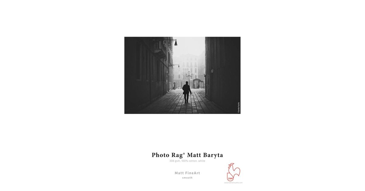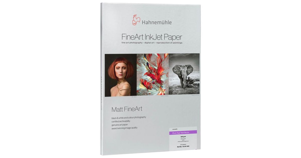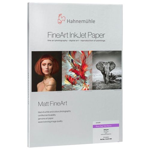 Hahnemühle Photo Rag Matt Baryta, the first matte baryta paper in the Photo Rag family, gives fine art prints a unique character and artistic touch. The white cotton paper contains no optical brighteners and has a very fine, subtle surface. Combined with the premium matte inkjet coating, it guarantees outstanding print results with impressive reproduction of vivid colors, details and deep blacks. The additional barium sulfate in the coating improves tonal range, sharpness as well as clarity of prints. Photo Rag Matt Baryta is distinguished by its unique coating. The printed areas exhibit an elegant, subtle sheen. The unprinted areas remain matte to show off the brilliance beautifully. This feature makes it an exclusive alternative to analog baryta paper.