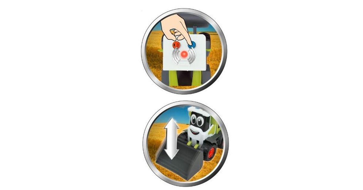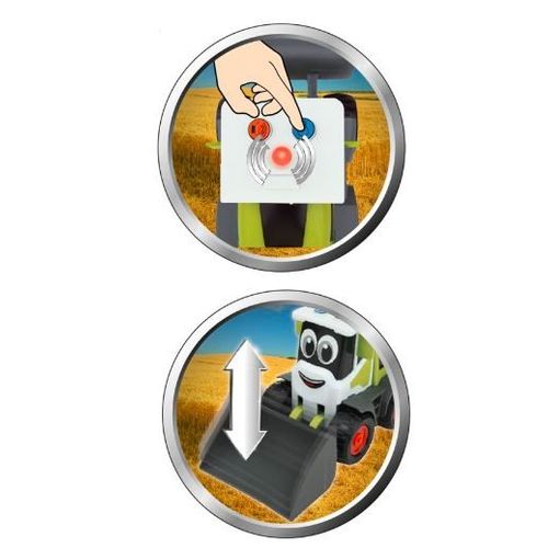 The charger is green with black wheels with red accessories. The loader has a manually lowered or raised bucket. After pressing the appropriate button in the cabin, the loader makes an engine sound and the warning lights come on. The charger is approx. 18 cm long. CLAAS Mini vehicles charm little ones with their sweet eyes and put a smile on their faces. The toy is child-friendly with rounded corners and edges and fits perfectly into the hands of small children.