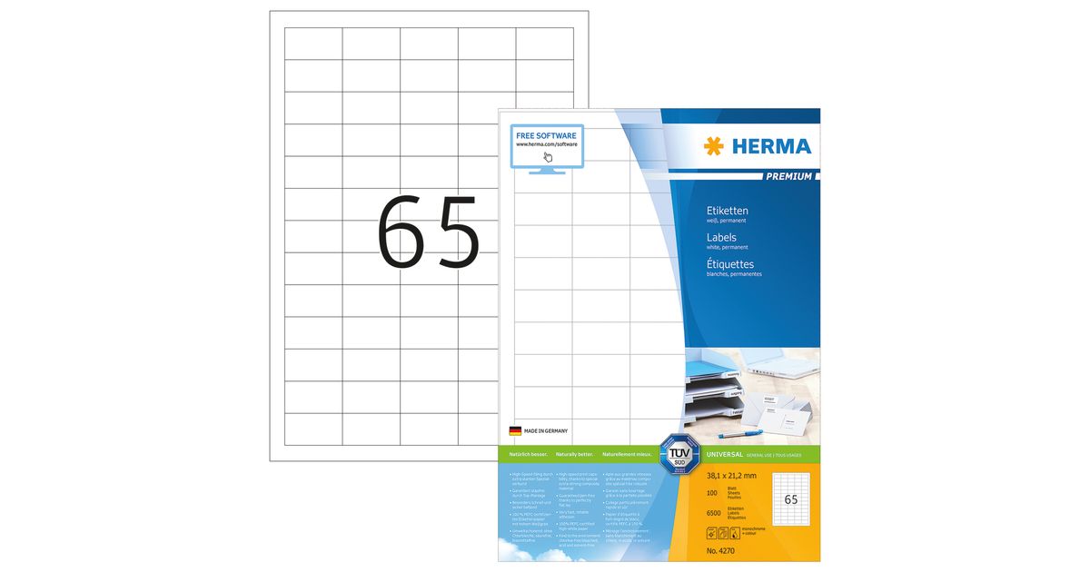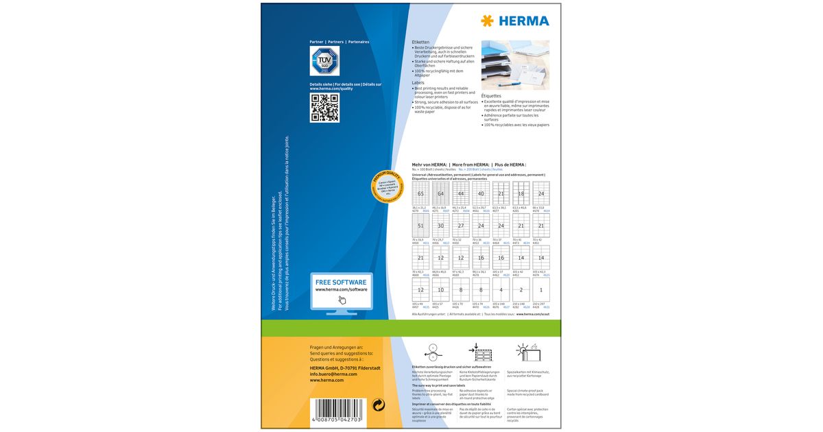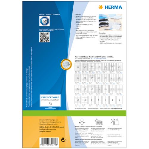 HERMA 4270, Valge, Iseliimuv printerisilt, A4, Paber, Laser/tint, Püsifilter