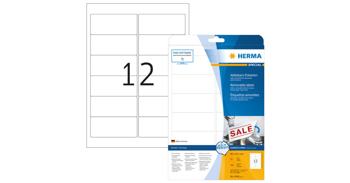 HERMA 4348, Valge, Iseliimuv printerisilt, A4, Paber, Laser/tint, Eemaldatav
