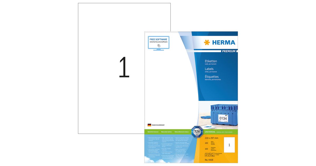 HERMA 4428, Valge, Iseliimuv printerisilt, A4, Paber, Laser/tint, Püsifilter