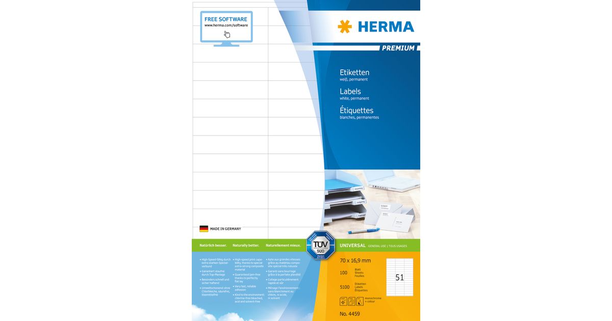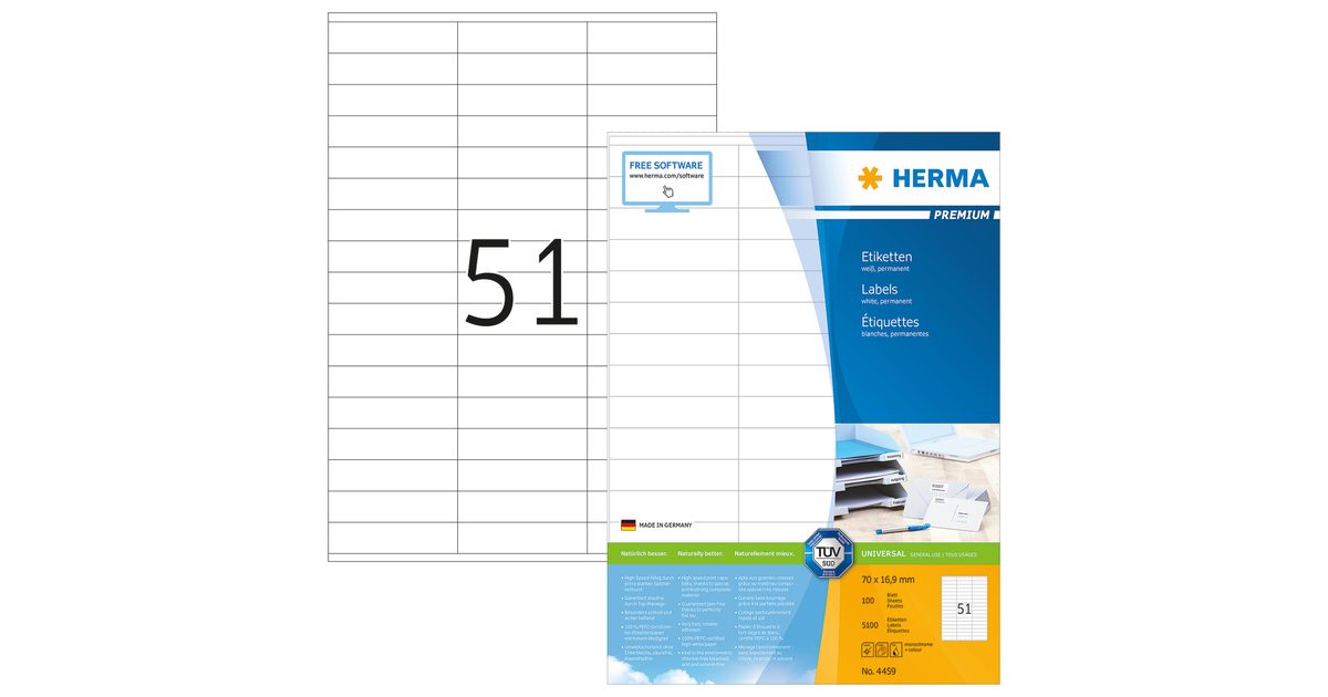 HERMA 4459, Valge, Iseliimuv printerisilt, A4, Paber, Laser/tint, Püsifilter