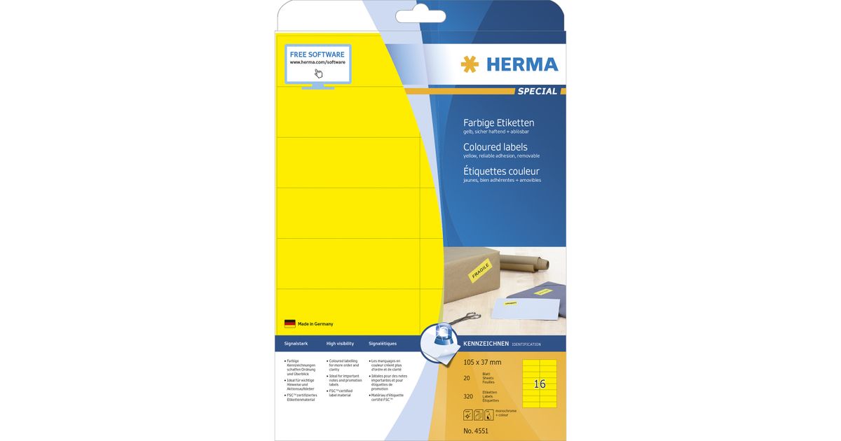 HERMA 4551, Kollane, Nelinurk, A4, Universaalne, Matt, Laser/tint
