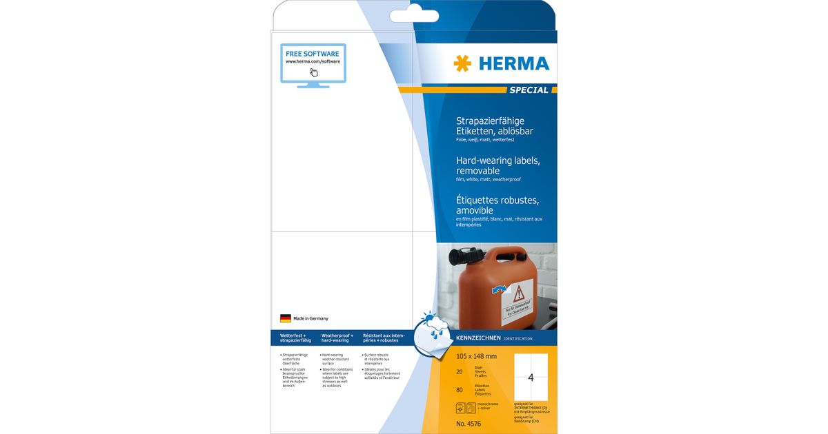 HERMA 4576, Valge, Eemaldatav, A4, -30 - 80 °C, 105 mm, 148 mm