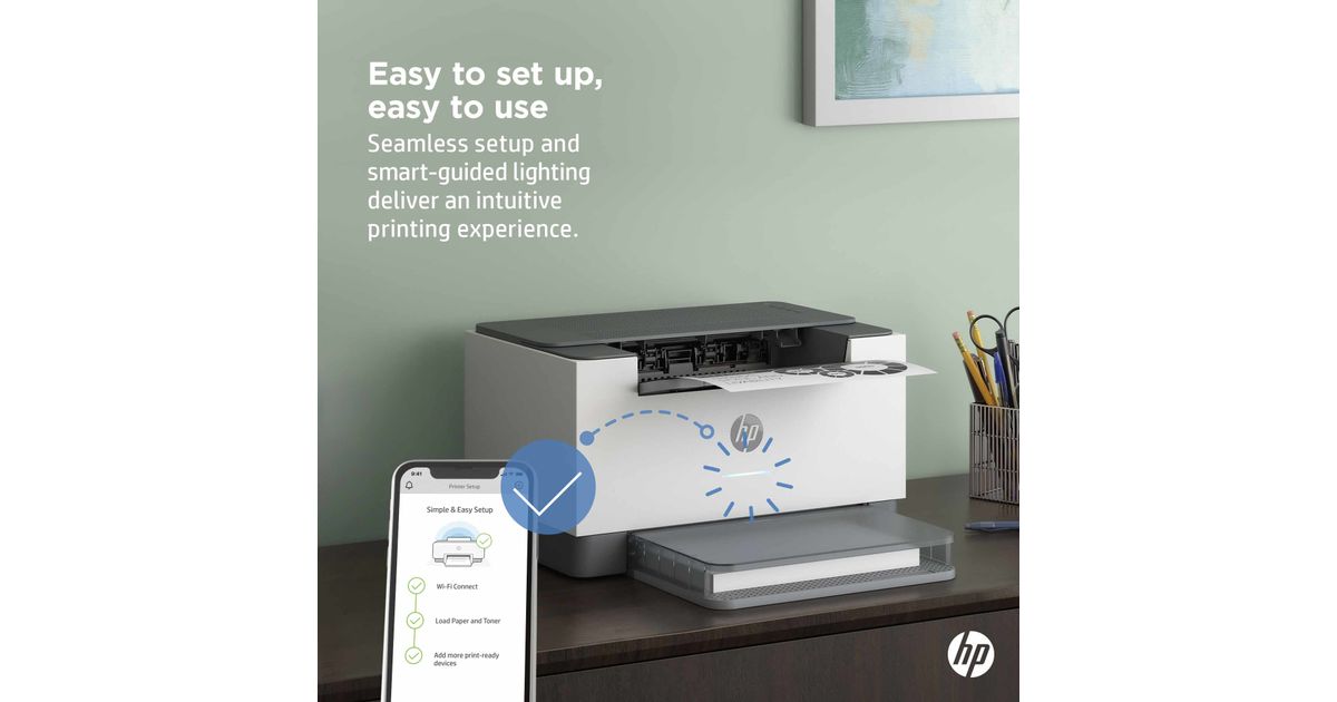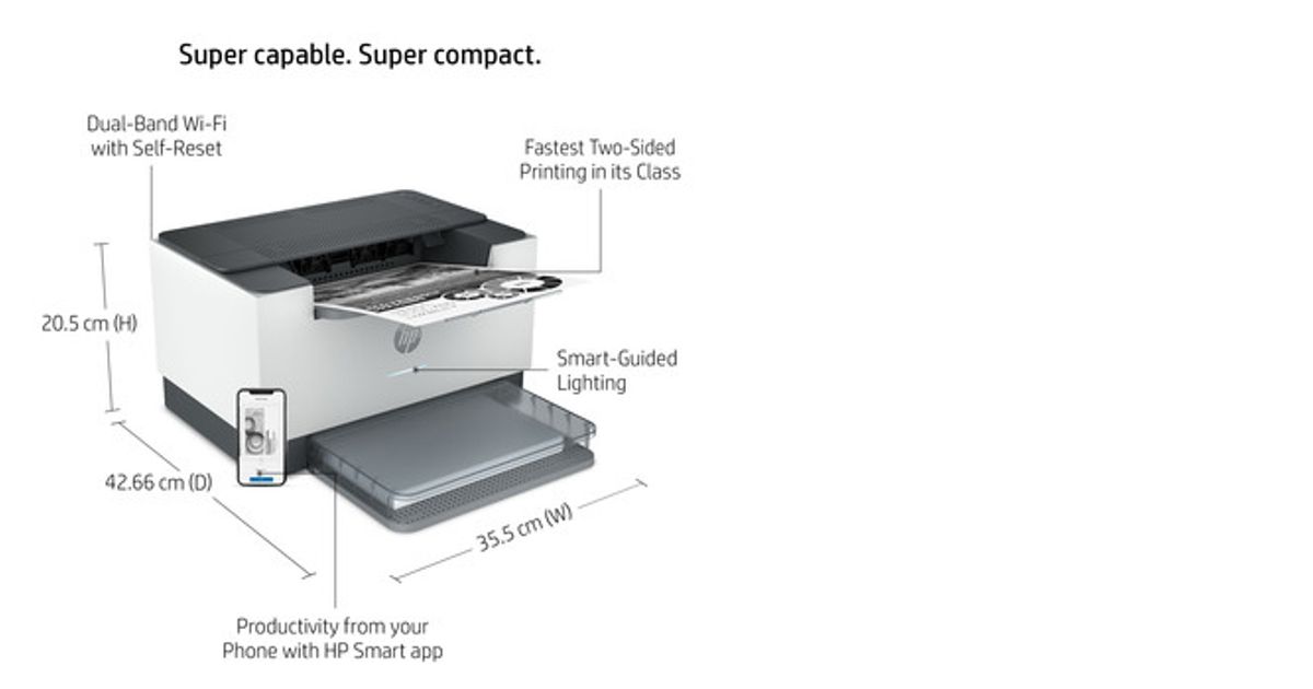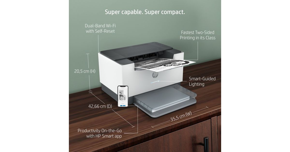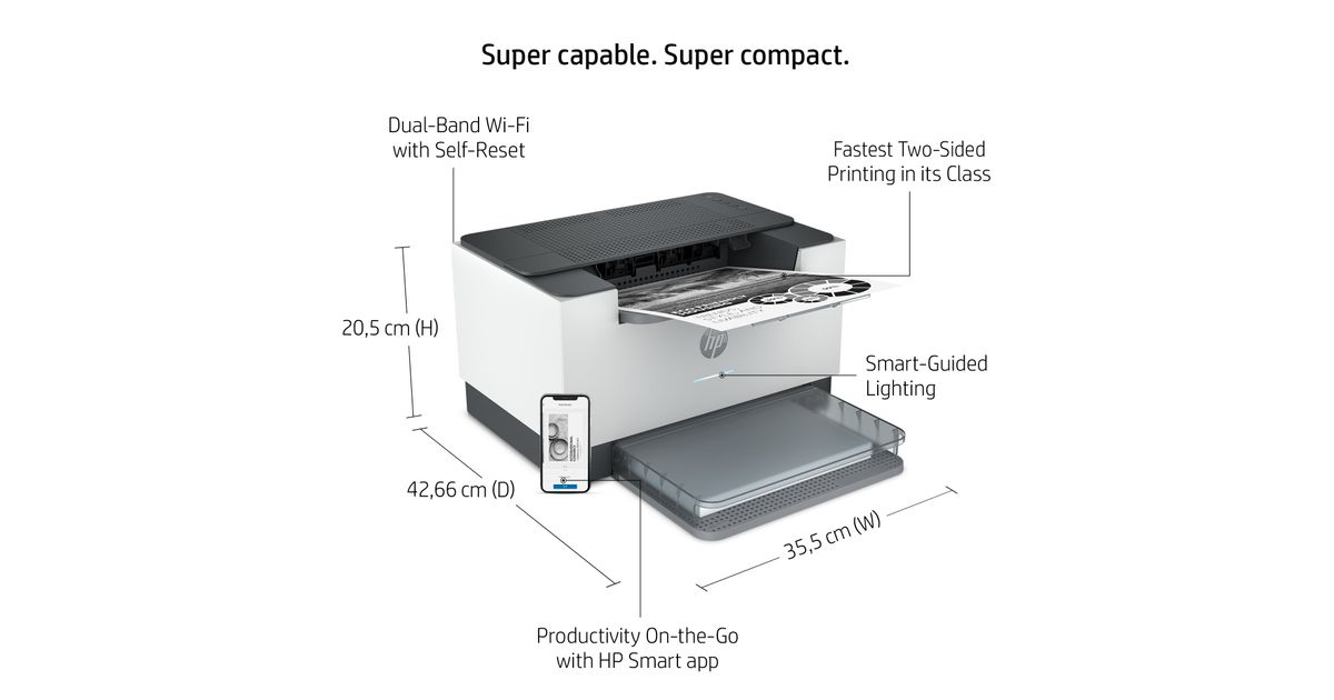 HP LaserJet Print: Up to 29/30 ppm (A4/Letter); Duplex: Up to 18/19 ipm (A4/Letter); Up to 20,000 pages per month; 1 USB port; 1 10/100 Ethernet port; Dual band Wi-Fi; Smart-guided buttons and lighting