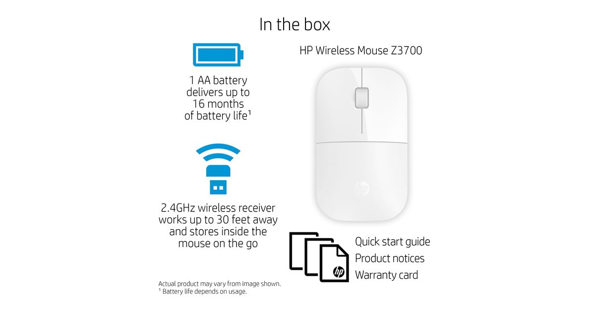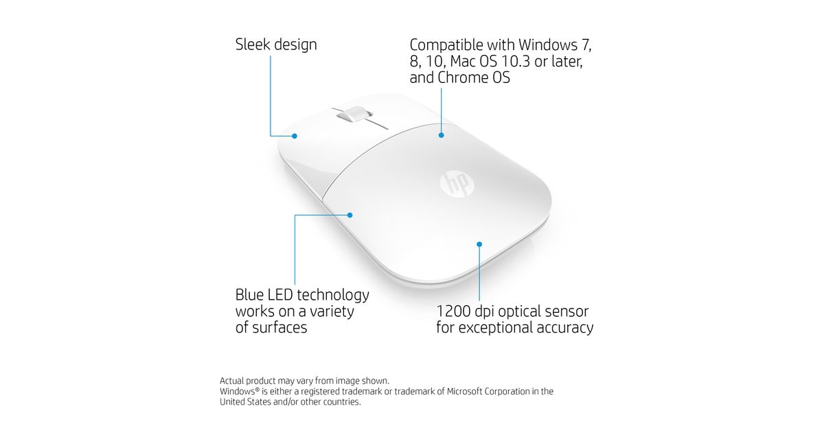 HP Z3700 White Wireless Mouse, Mõlemakäeline, Optiline, Raadioside, 1200 DPI, Valge