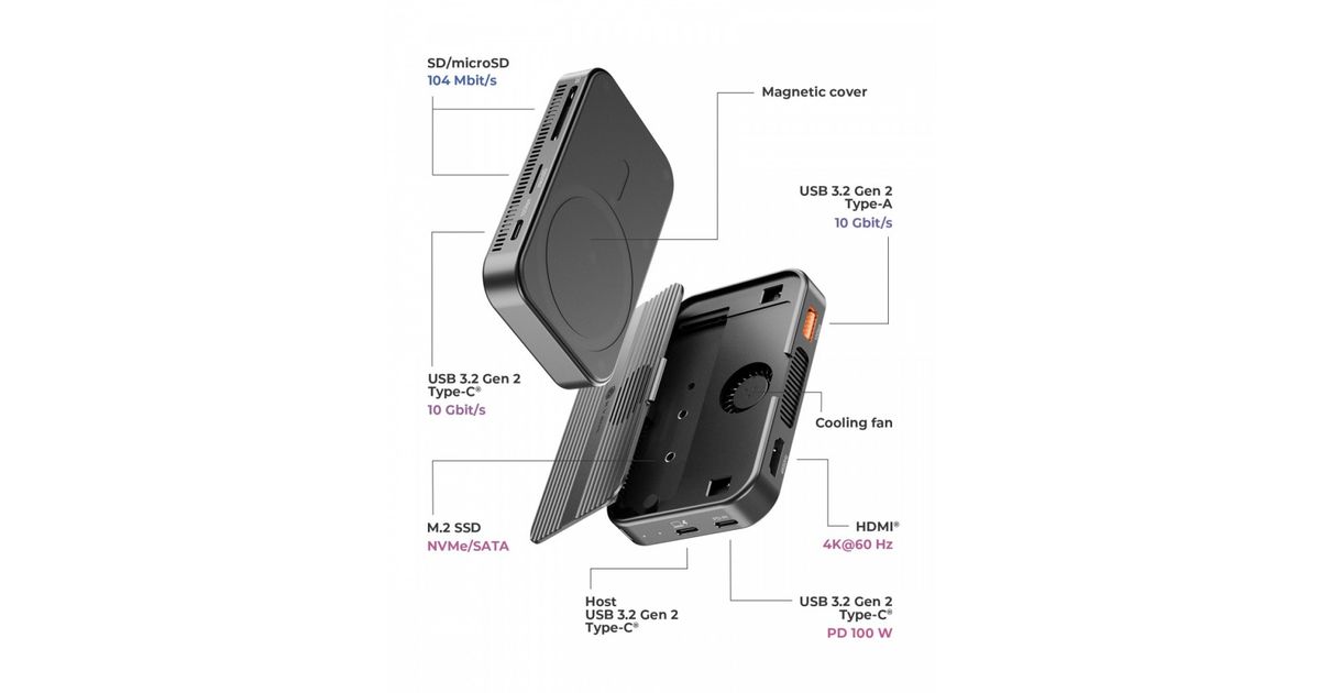 M.2 NVMe and SATA - This DockingStation combines powerful connectivity with fast external storage by integrating a high-speed M.2 NVMe and SATA SSD enclosure. Supporting capacities up to 8 TB, its a practical solution for handling large files, backups, or media librariesall from one compact, all-in-one device on your desk. Connectivity for Work and Play - Equipped with USB Type-C and USB Type-A (Gen 2) ports offering transfer rates up to 10 Gbit/s, this DockingStation handles fast data transfers with ease. It also features an HDMI port for 4K@60 Hz displays and SD/microSD slots supporting speeds up to 104 MB/s. Magnetic Attachment Features a magnetic cover that allows it to attach securely to the back of your phone or other compatible devices. This makes it incredibly convenient for users who need extra storage on the go Power Delivery 3.0 - Stay powered throughout the day with a USB Type-C PD-IN port that supports up to 100 watts of power delivery. Simply connect your USB Type-C power supply to keep your DockingStation and connected devices charged without needing extra adapters or cluttering your workspace. Operating System - Whether youre working on Windows, macOS, or Linux, this DockingStation fits into your existing setup. Its designed to work with a wide range of devices and system environments, so you can switch between workstations without worrying about compatibility or needing separate accessories for each system.
