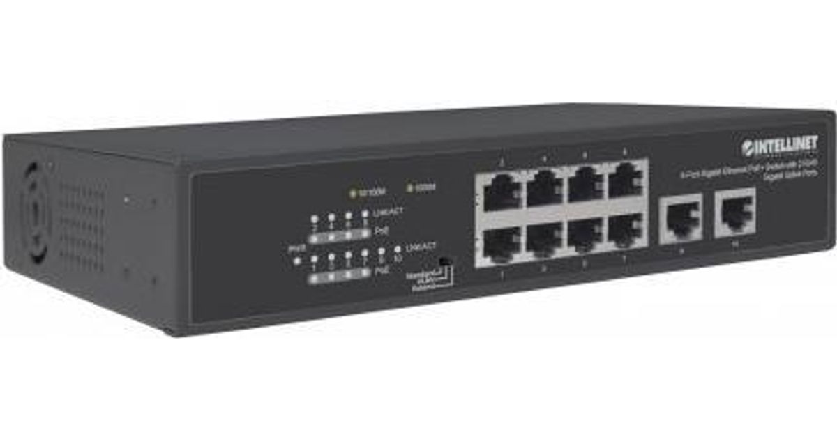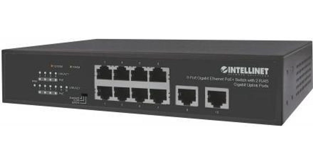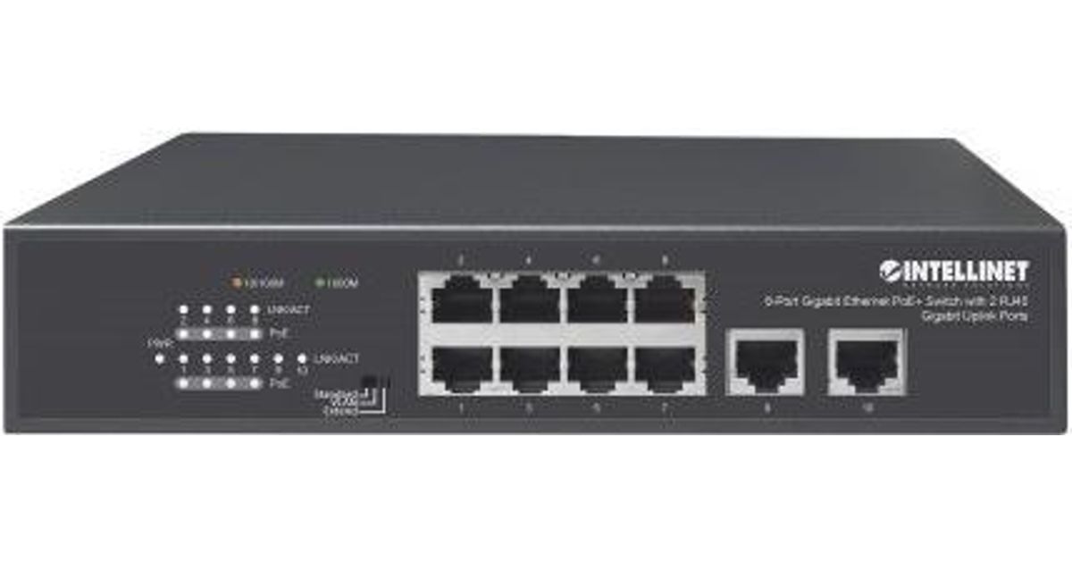 INTELLINET 8-Port Gigabit Ethernet PoE+ Switch mit 2 RJ45 Gigabit Uplink-Ports IEEE 802.3at/af Power over Ethernet (PoE+/PoE)-konform, 120 W, Endspan, Desktop (561402)