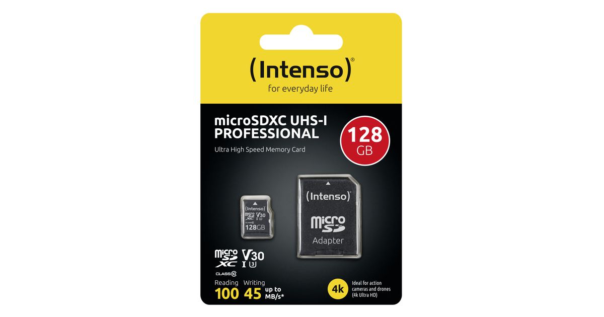 Intenso microSDXC 128GB Class 10 UHS-I Professional - Extended Capacity SD (MicroSDHC), 128 GB, MicroSDXC, Klass 10, UHS-I, 100 MB/s, 45 MB/s