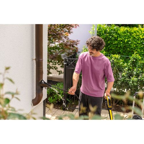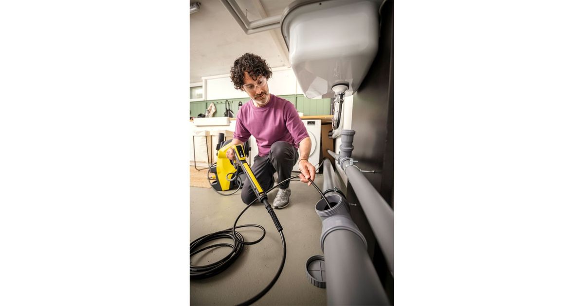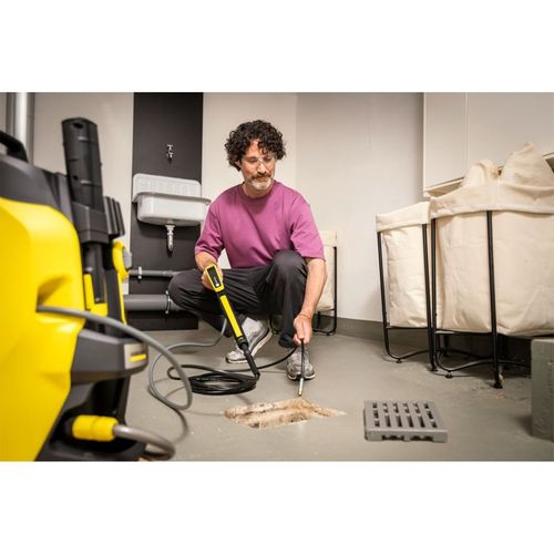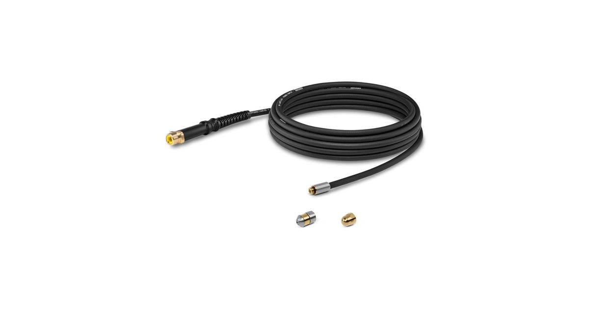 The practical and versatile pipe cleaning set for cleaning pipes, drains and downpipes and for effectively clearing blockages. The scope of delivery includes 2 different nozzles, which can be changed quickly thanks to the screw connection. The jet nozzle has a strong forward thrust with 4 high-pressure jets directed backwards - ideal for downpipes and for removing solid blockages. The rotating nozzle is used for preventive maintenance cleaning. With its 360° cleaning effect, deposits on the inner walls of pipes are effectively removed. This prevents blockages from occurring in the first place. Thanks to the optimized shape of the nozzles, they are connected to the high-pressure hose without edges. This minimizes the risk of the nozzle getting caught in the pipe. The 7.5 meter long, flexible quality hose is reinforced with textile braiding - for easy handling in angled pipe systems. The hose with kink protection and brass connections ensure a long service life. Suitable for indoor and outdoor use with all Kärcher class K 2 to K 7 high-pressure cleaners.