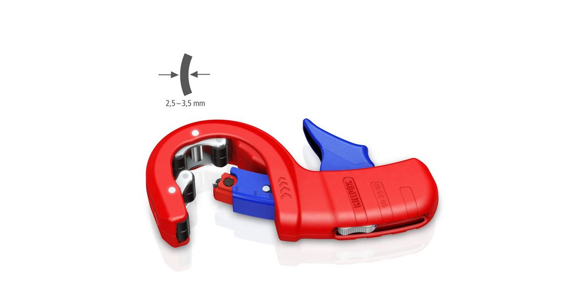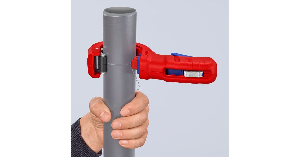 The KNIPEX pipe cutter DP50 is a precise tool for cutting and chamfering plastic drain pipes up to 50 mm in diameter. Thanks to sliding bearing rollers and self-adjusting guide, it allows effortless handling. The turning blade ensures a clean cut without reworking and can be changed without tools.