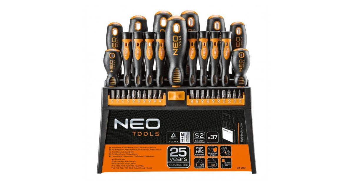 Komplekti kuuluvad magnetilise otsikuga, kolmnurkse käepidemega kruvikeerajad aluse peal - lapik 2,5x40mm, 5x75mm, 6x38mm, 6x100mm ja 8x150mm; PH00x40mm, PH0x40mm, PH1x75mm, PH2x38mm, PH2x100mm ja PH3x150mm; TX5X40mm, TX6x40mm, TX7x40mm ja TX8x40mm. Otsikud: lapik 4, 5 ja 6 mm; PH1, PH2 ja PH3; PZ0, PZ1, PZ2 ja PZ3; TX10, TX15, TX20, TX25, TX30 ja TX40; HEX3, HEX4, HEX5 ja HEX6.