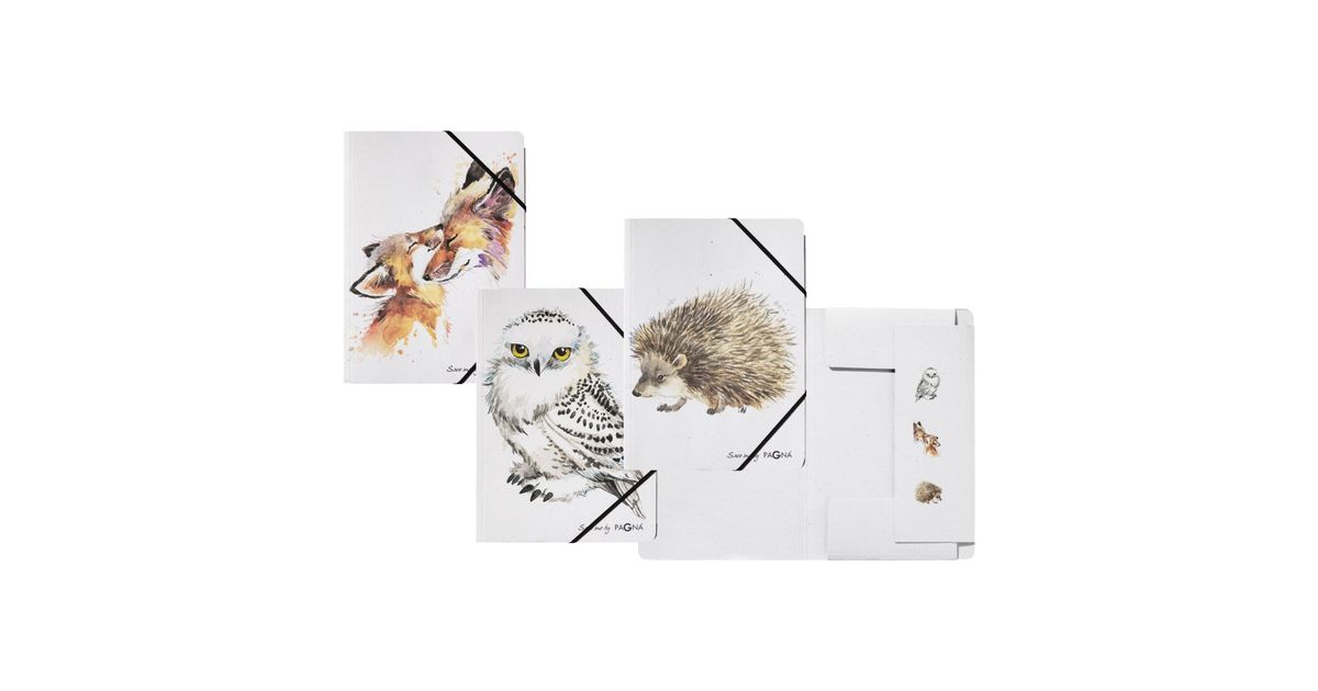Akvarellmaali stiilis taaskasutatud kartongile trükitud rebane, öökull ja siil.