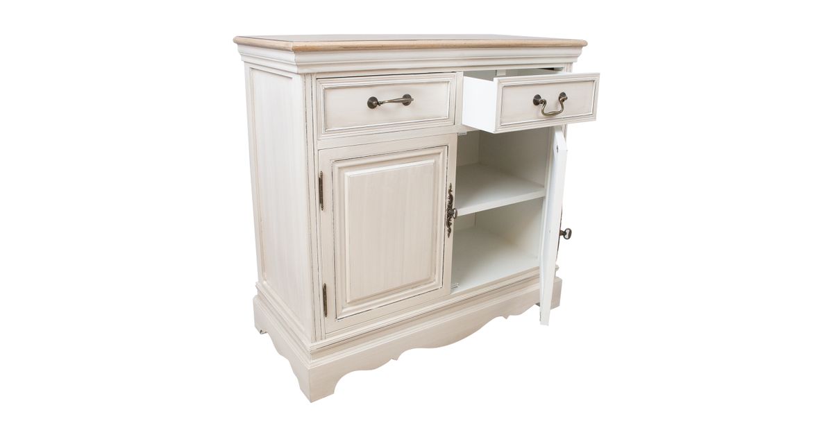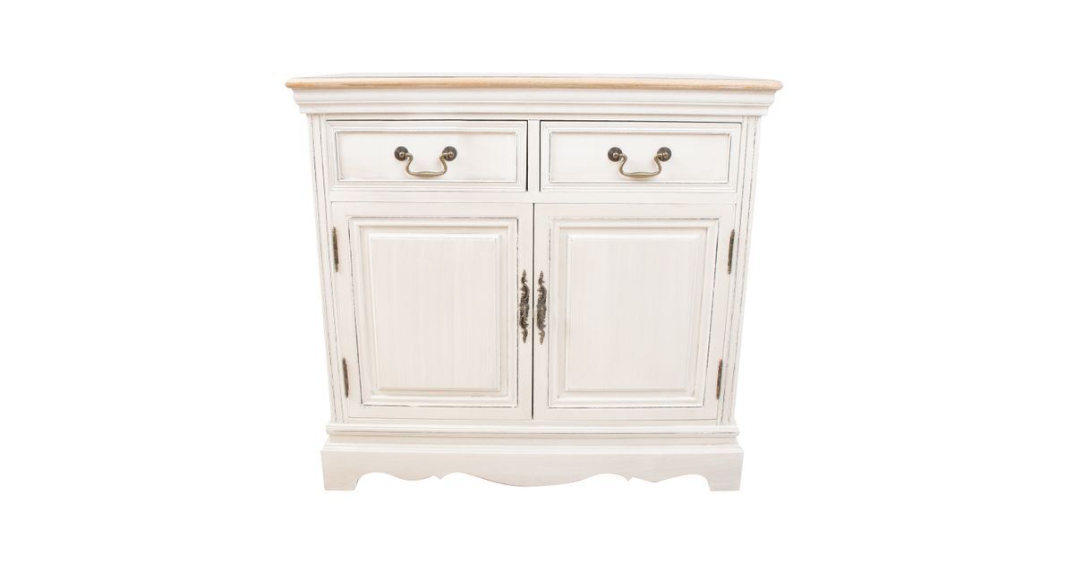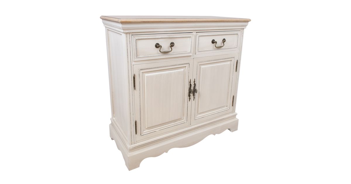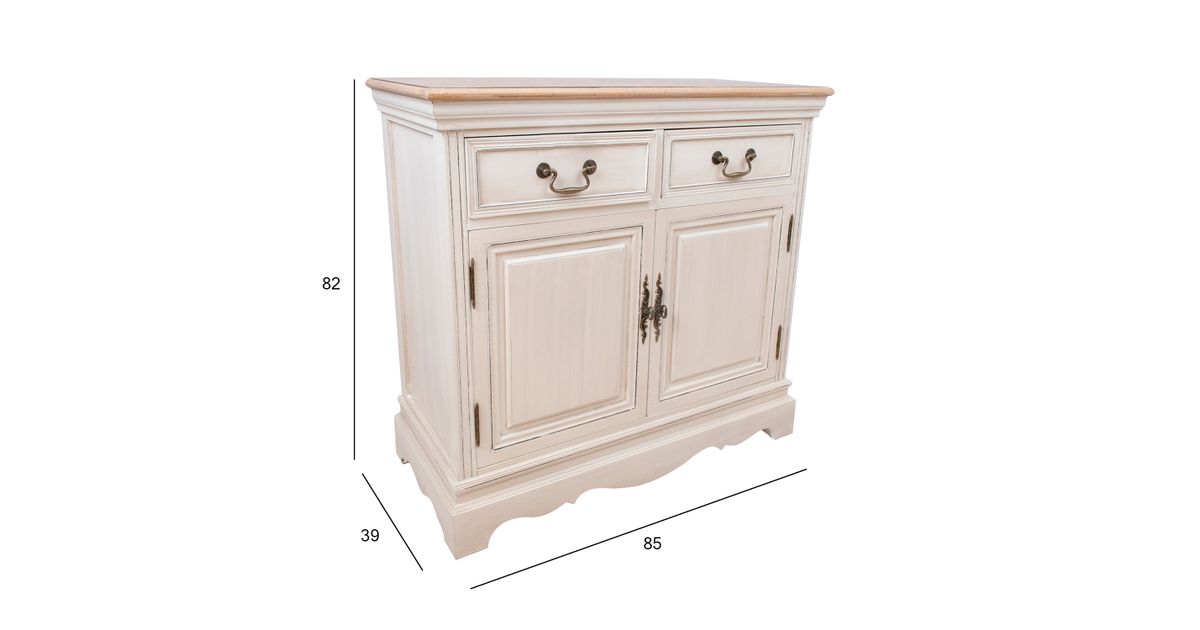 Kummut SAMIRA 2-ukse ja 2-sahtliga, 85x39xH82cm. Pealmine plaat: antiikpruun, raam/sahtlid: antiikvalge. 2 sahtlit ja 2 kapiust metallist käepidemetega. Sahtlid ilma siinideta. 2 ukse taga on kapis 1 riiul. Laineline sokliäär. Puit: saar, paulownia, viimistlus: värvitud.