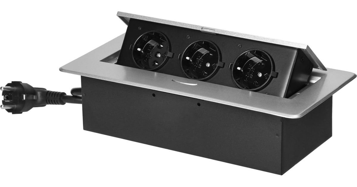 Lauaplaadi sisse süvistatud Orno Mööbli pistikupesa tasase freesitud serva ja 1,5 m kaabliga, 3x2P+Z (Schuko), hõbedane