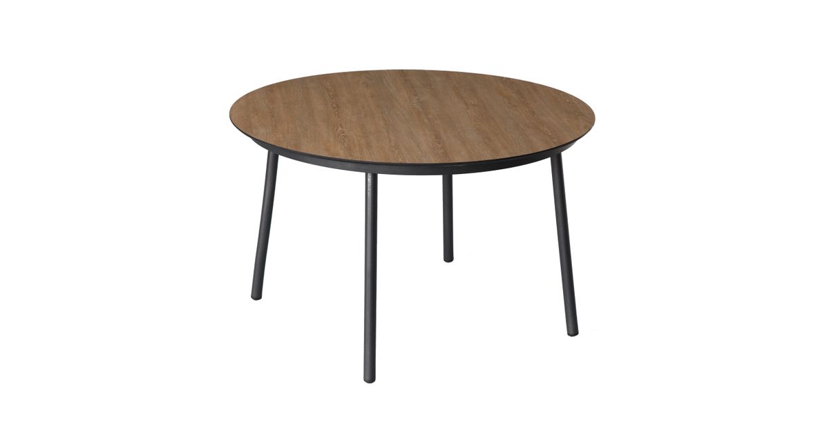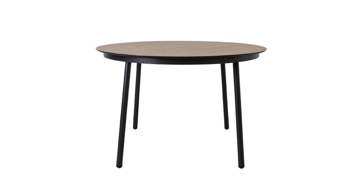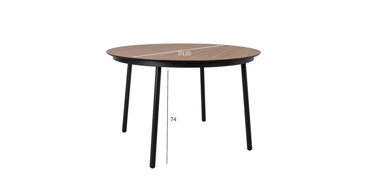Lauaplaat: tiikpuu dekooriga ilmastikukindel laminaat. Jalad ja raam on valmistaud alumiiniumist ning kaetud musta pulbervärviga.
